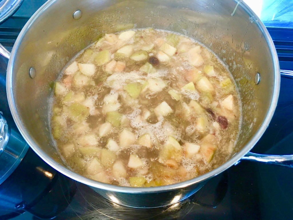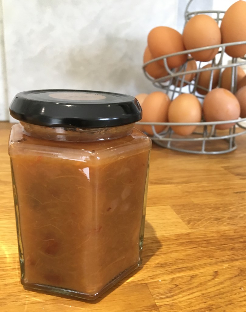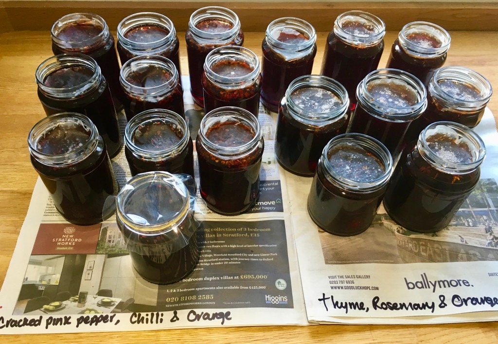 I started with the obligatory Apple and Rhubarb chutney. We eat gallons of it, ringing the changes with different spices or partners in each batch, working from a basic recipe – each year I get more confident with variations, but in a chutney you can’t really go far wrong with spices (dried, as well as fresh ginger and home grown chilli), vegetables, fresh and dried fruit. See a basic Apple & Rhubarb recipe here (I chopped the whole, unpeeled oranges up and included, rather than just adding juice): https://www.olivemagazine.com/recipes/entertain/rhubarb-and-apple-chutney/