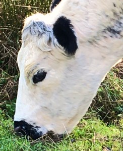 British White Cattle, making the most of the watery sunshine on a chilly winter’s morning. The British White breed is usually docile. Being polled (no horns), they are easily managed – though conversely, with our Soay Sheep, we find their horns make them easier to manage – it’s always Honey, our Soay with no horns, who gets up to the most mischief…