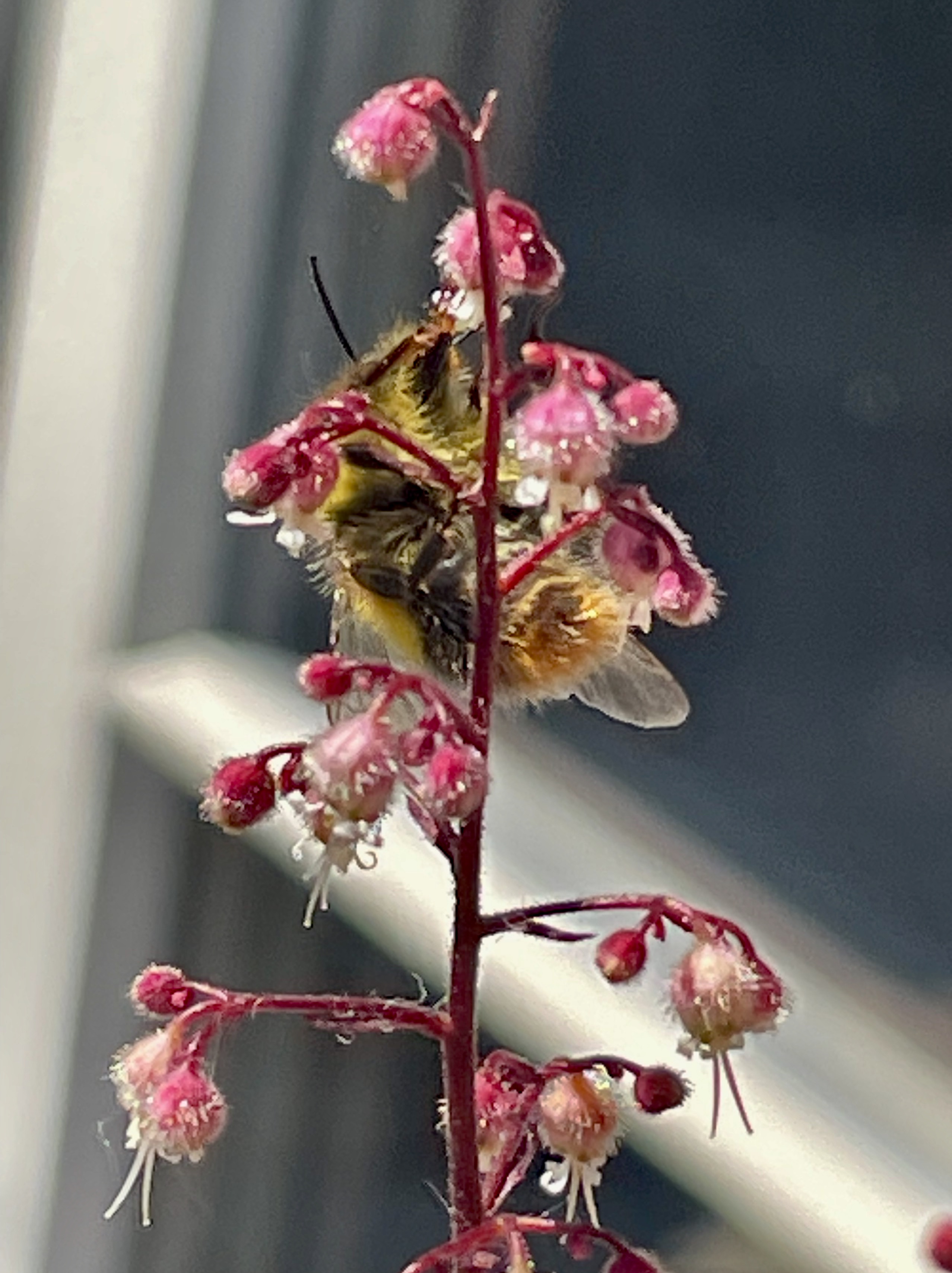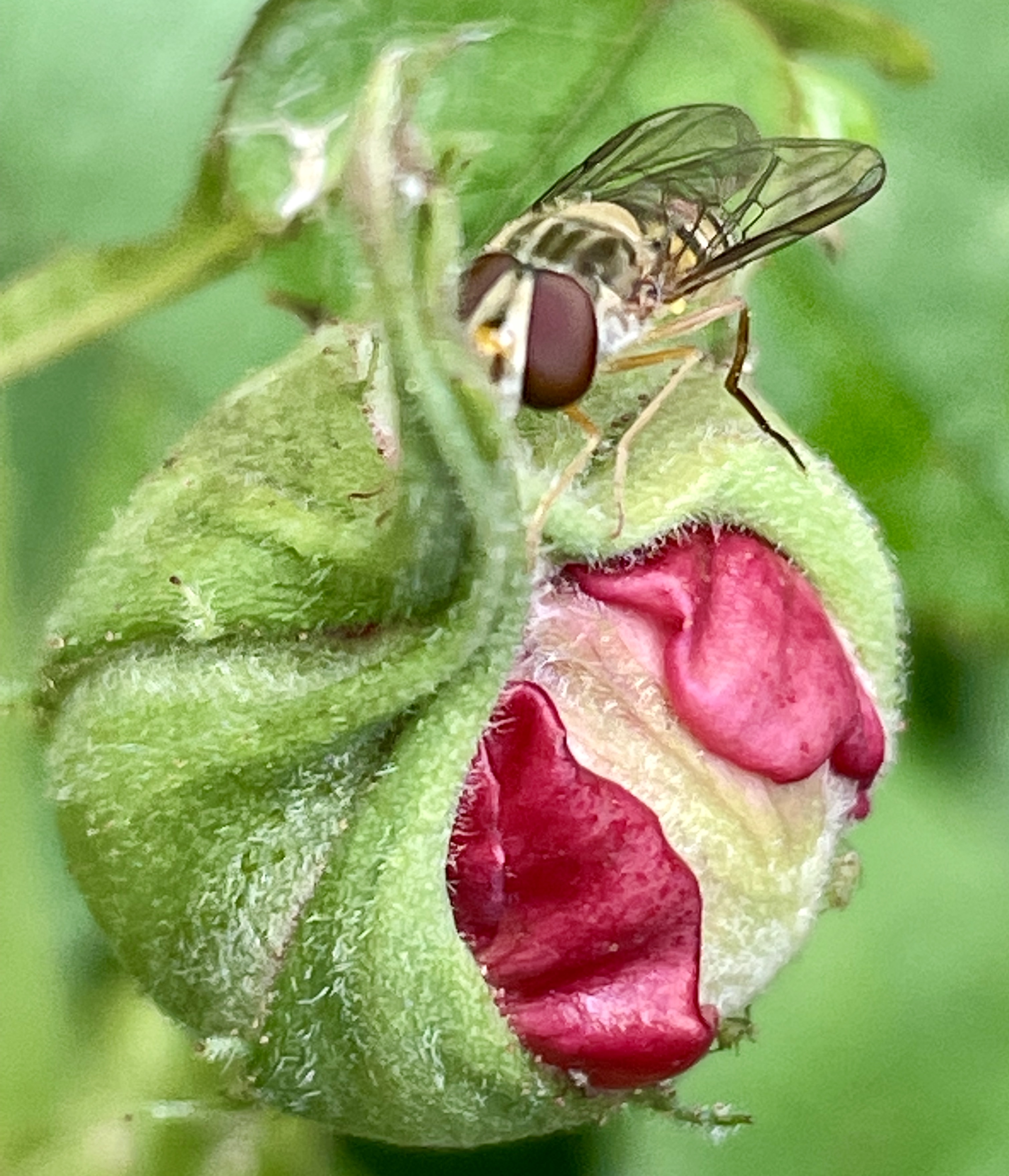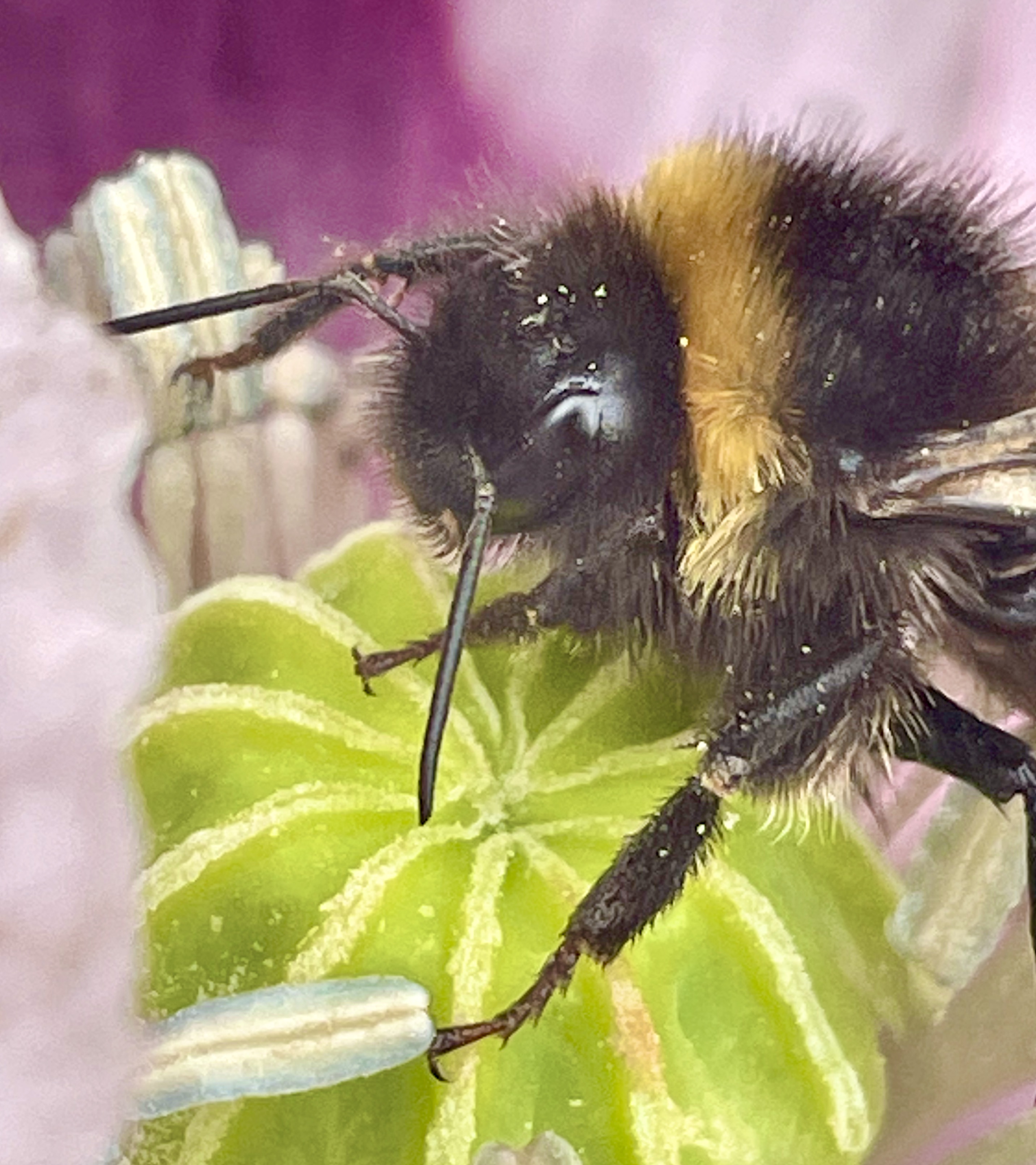 Both expert pollinators, hoverflies and bees can be confused; but the former have huge beedy eyes and one set of wings, whilst bees have smaller eyes and 2 sets of wings. Both will bee happy if there are lots of flowers for them to buzz amongst 🙂