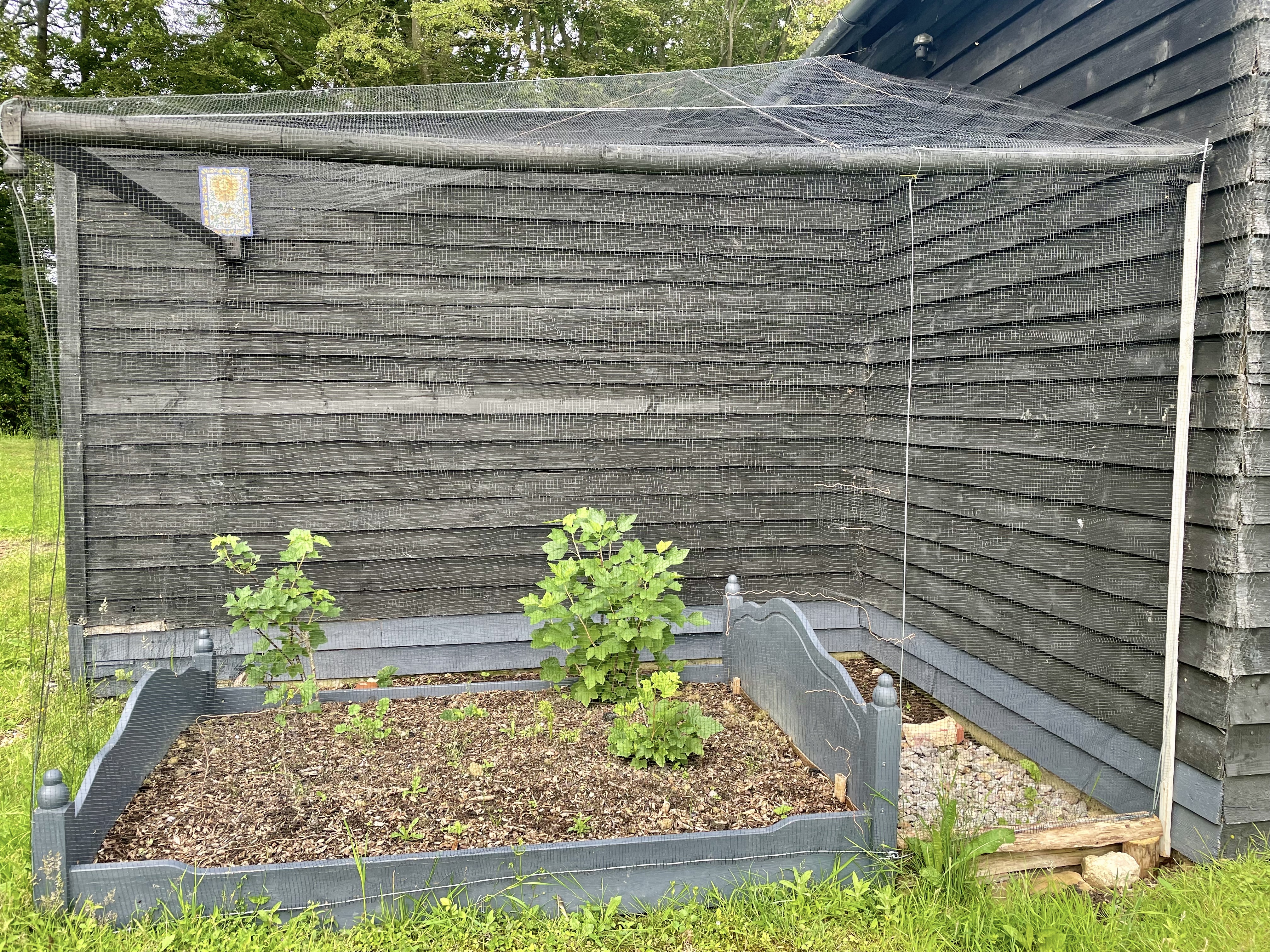 So this month we painted the wooden frame, made from long birch branches coppiced from our woodland strip, in black outdoor wood preservative matching the barn. New bird proof netting and rabbit proofing in the form of chicken wire, matching that we used last year for our vegetable garden frame has completed the refurbishment.