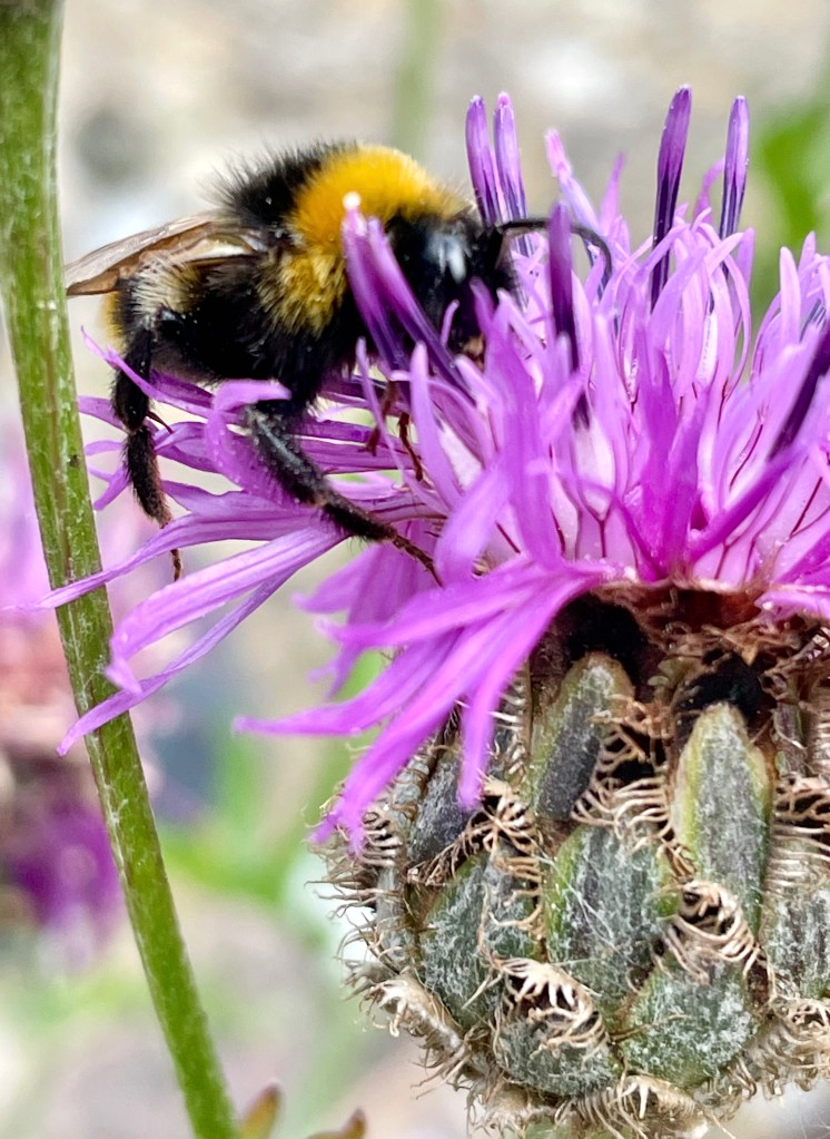 At the end of last year, we started propagating several flowers for their attraction to bees. The varieties we chose also had to be ‘rabbit and deer proof’. Always an added challenge here. All have done well, but Knapweed is a revelation to me. It’s been like a total magnet to our winged friends – when in flower, the beautiful, shaggy pink / purple blooms never have less than two bees on each cushioned head.