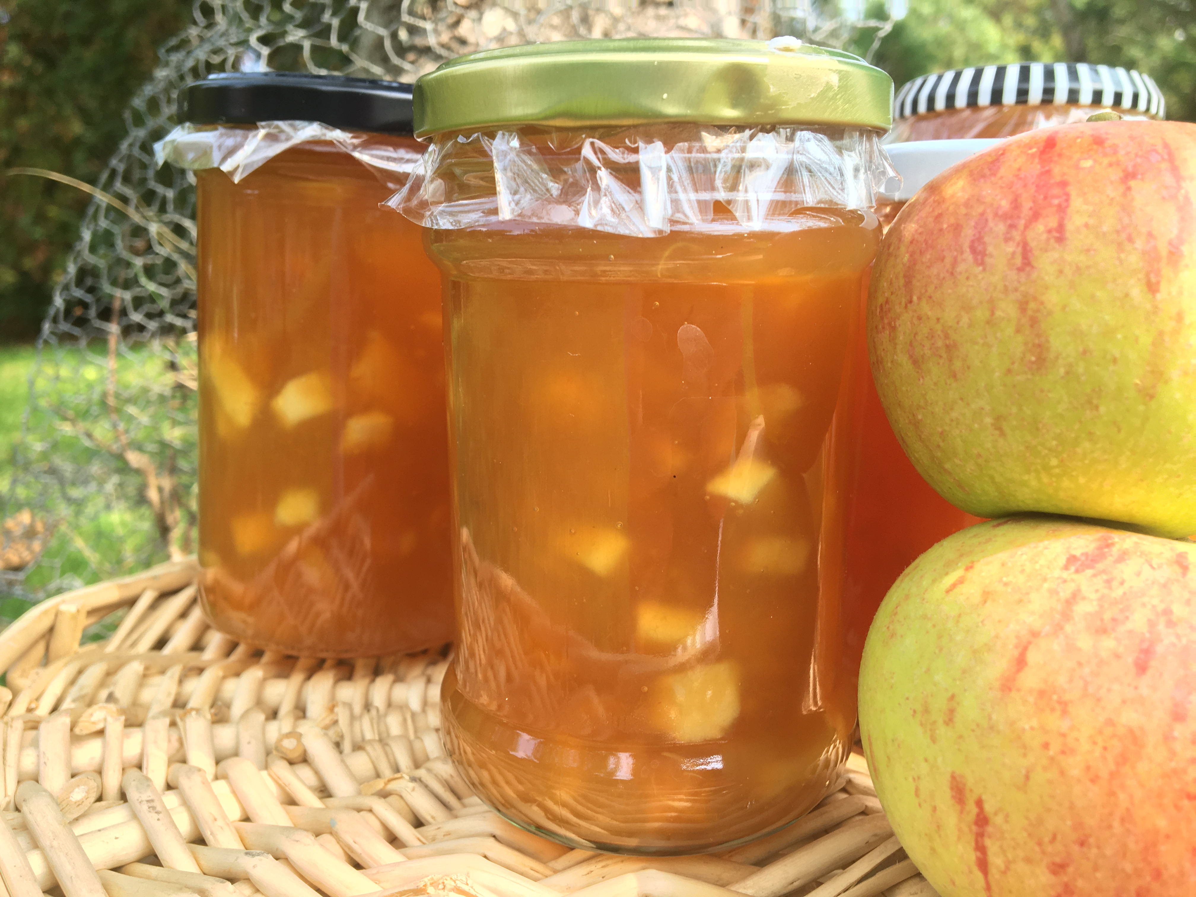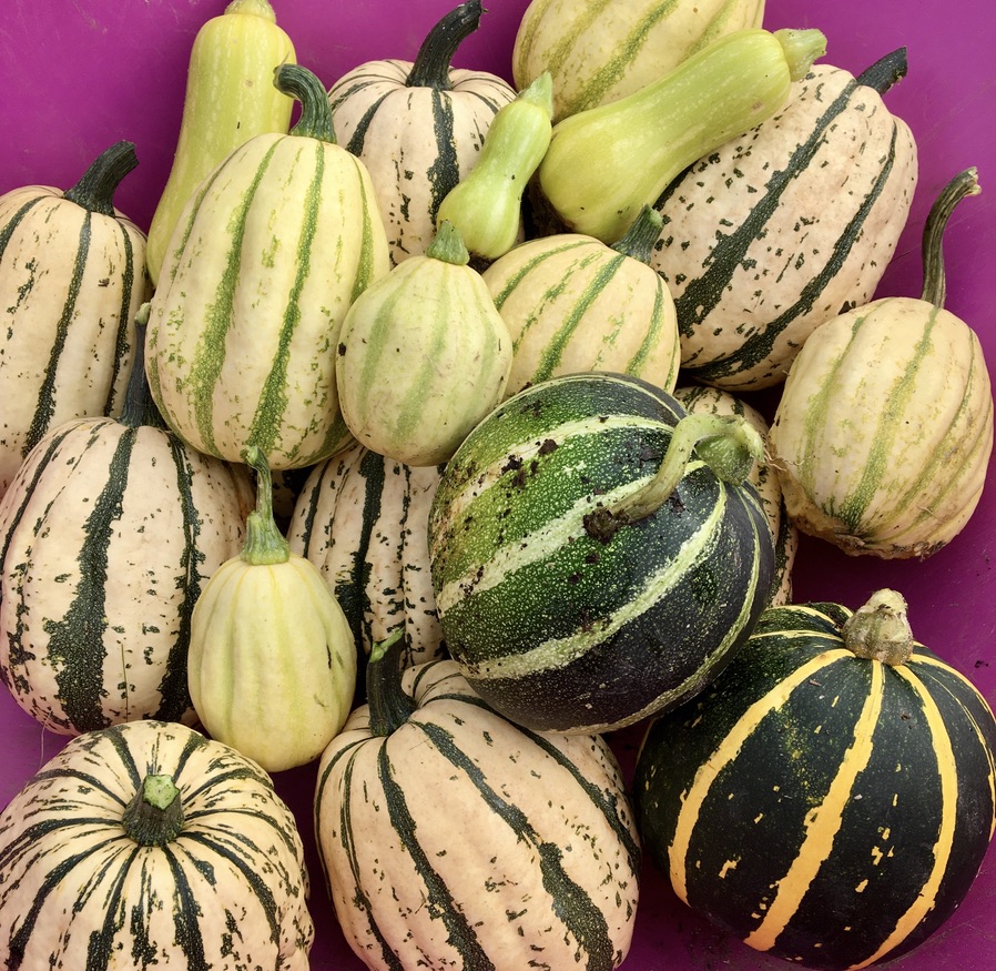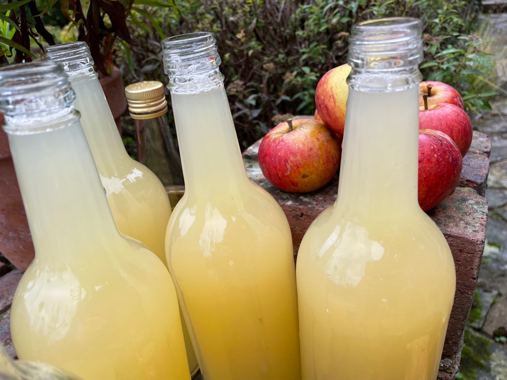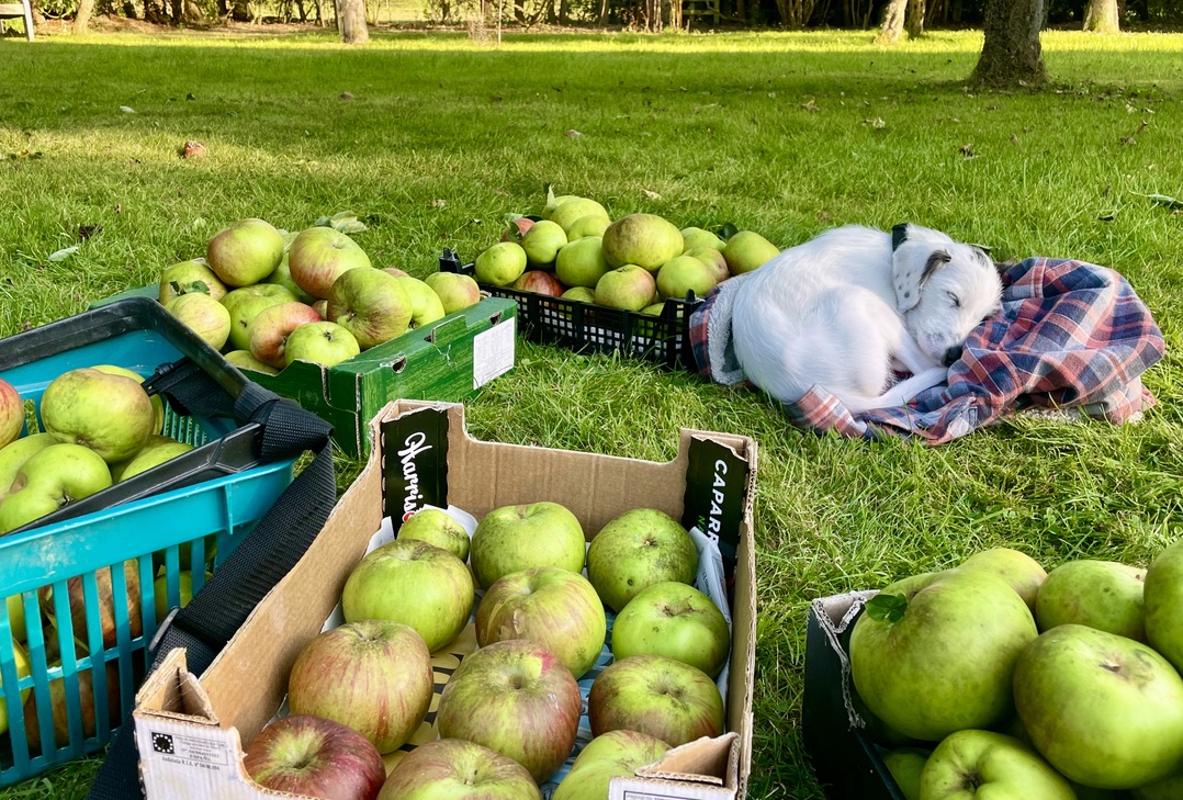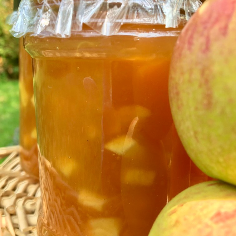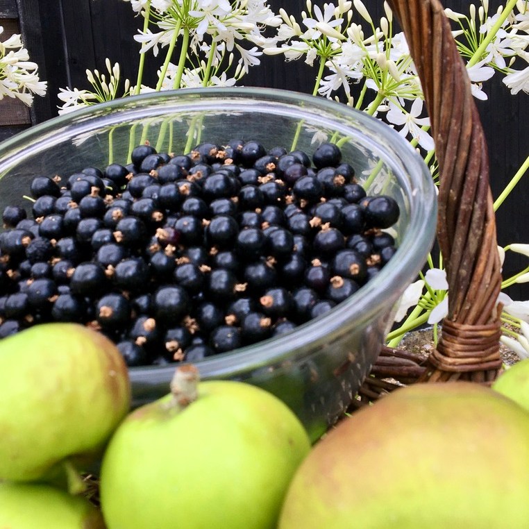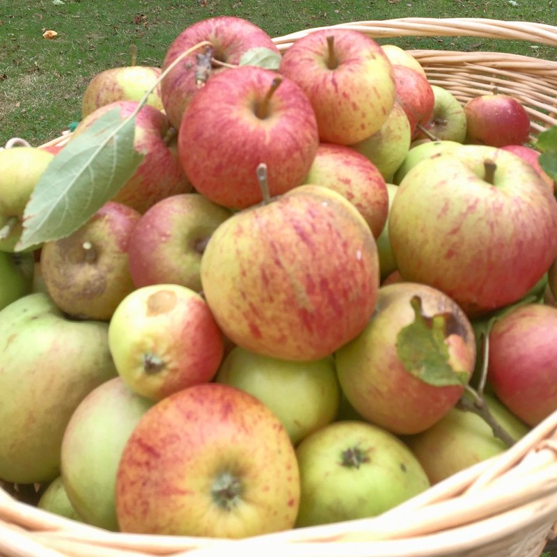 Dried apple slices or whole stored fruit, stacked in boxes and nestled individually in home grown hay from the Wild Flower strip. Also frozen currants & gooseberries. Dried Kale and dried tomatoes, flavoured kombucha, Marigold & herbal teas, and various fruit chutneys, jellies and jams. As well as Sloe and Rhubarb gin, from the plentifully abundant crops this year!