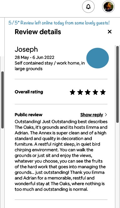 ” 5/5: Great stay! We were made to feel so welcome at The Oaks by the lovely hosts.The accommodation is beautifully decorated, cosy and spotlessly clean and set in an amazing garden. Highly recommend and hope to return again.”