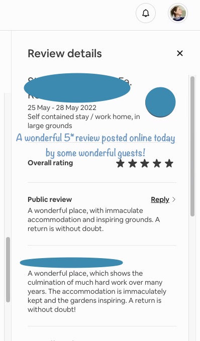 “Thank you so much. We had a lovely, peaceful, much needed break. Your huge grounds and the annexe are just beautiful. Thank you x”