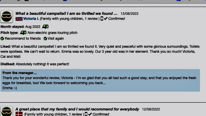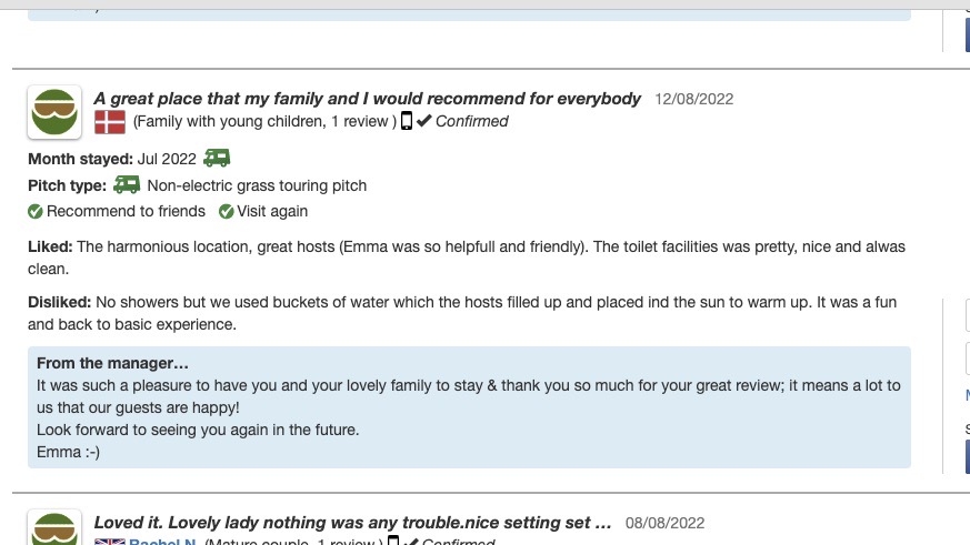 Thank you to Emma and Adrian for a lovely weekends stay in your camping field. Lovely hosts who take a real pride in their home and garden. A lovely couple who make you feel very welcome and are very accommodating. Simple back to nature style with well maintained grounds. Large sink for washing up, clean toilets, little shed with some outdoor games equipment and a couple of extra camping chairs for use. Ideal for a weekend away. Thank you again and see you next year.
