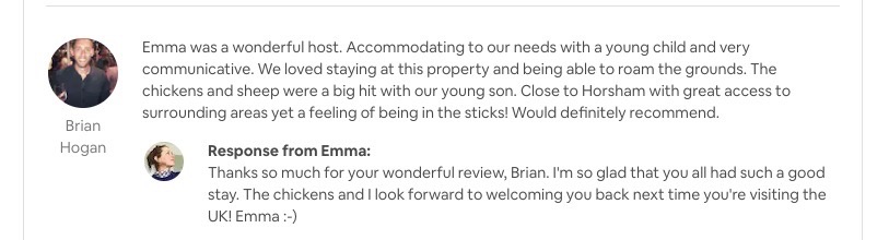 “A brilliant little place, self-contained on beautiful grounds, of which you have great views. Easy access to beauty spots in High Weald and the Surrey Hills but also extremely convenient for amenities in Horsham.. The property is spotless, comfortable, and has excellent facilities such as a proper kitchen and full bath. Emma is a natural host – easily contactable and friendly. Highly recommended spot for couples seeking a getaway. We had a lovely weekend here.”