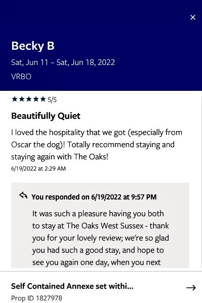 “The Oaks is a great place for a quiet, peaceful getaway from busy London. The house and surroundings especially the garden and flowers in the backyard are just amazing. There is lots to walk and explore and lots of open space. Emma was very helpful and went above and beyond to assist us during our stay with them. We absolutely loved the cosy annexe and would love to go back there. Itโs very close to Horsham and some other very nice National Trust sites in West Sussex.”