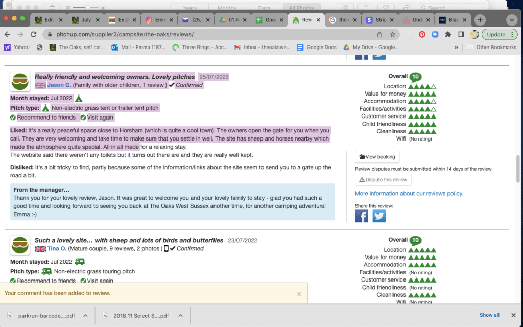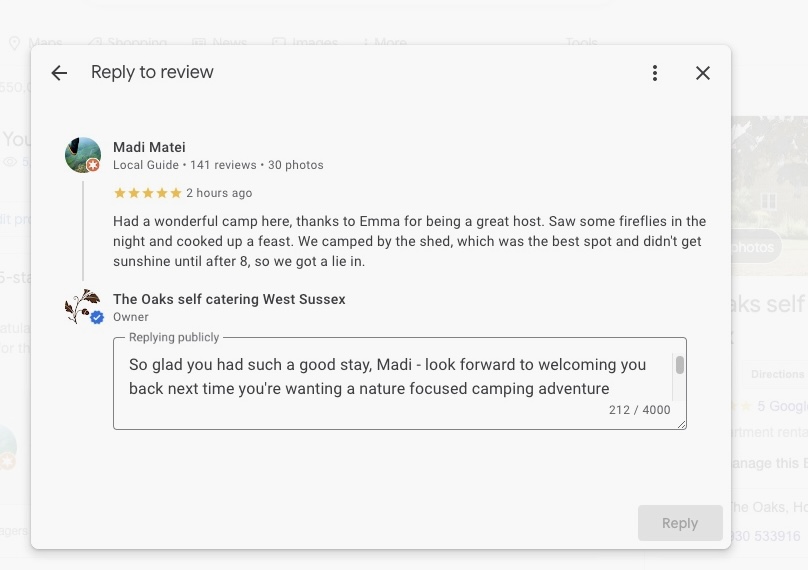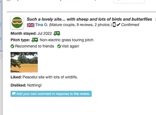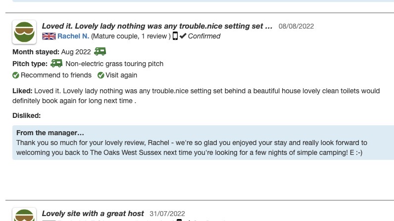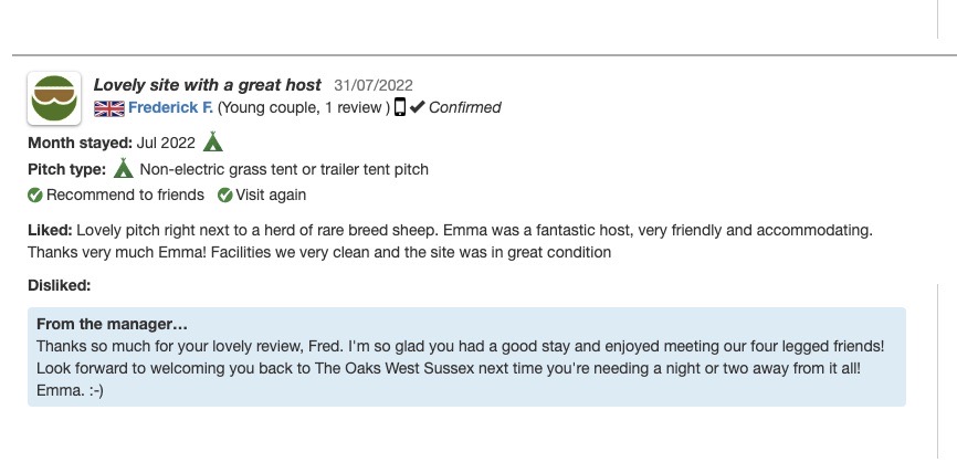 Online review for camping: “The Oaks is a wonderful site, secluded and private. The site is as advertised, basic but with the necessary amenities. It was very peaceful, and the sheep close by were a lovely addition to the whole experience. The hosts were cultivating wild flowers and grasses which meant there were areas of the site which were not cut. This added to the peace and tranquility of the setting… There were beautiful walks around the site, great local pubs and Horsham town centre was nearby for stocking up on provisions. I can’t fault the site or the hosts. Would highly recommend.“