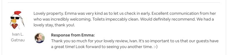 “Very clean and well equipped with great hospitality. Thanks to lovely hosts for a warm welcome and quick response re booking. A wonderful stay with very special memories. Emma you are a super-duper host! Thanks again x 1 million!”